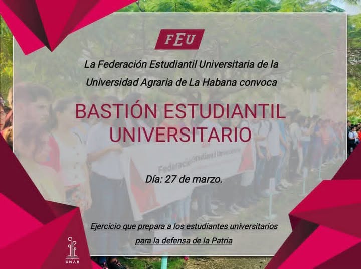 La máxima dirección de la Federación Estudiantil Universitaria (FEU) de la Universidad Agraria de La Habana “Fructuoso Rodríguez Pérez” (UNAH) ubicada en San José de las Lajas, convoca a los educandos de sus diferentes facultades participar en el Bastión Estudiantil Universitario a efectuarse el 27 de marzo en cada Centro Universitario Municipal CUM de la provincia Mayabeque.