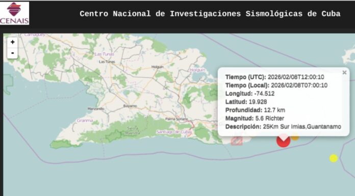 Los sismógrafos del Centro Nacional de Investigaciones Sismológicas de Cuba registraron hoy a las 07:00:10 un sismo de 5.6 grados en la escala de Richter, a 31 kilómetros al sureste de Imías, Guantánamo.