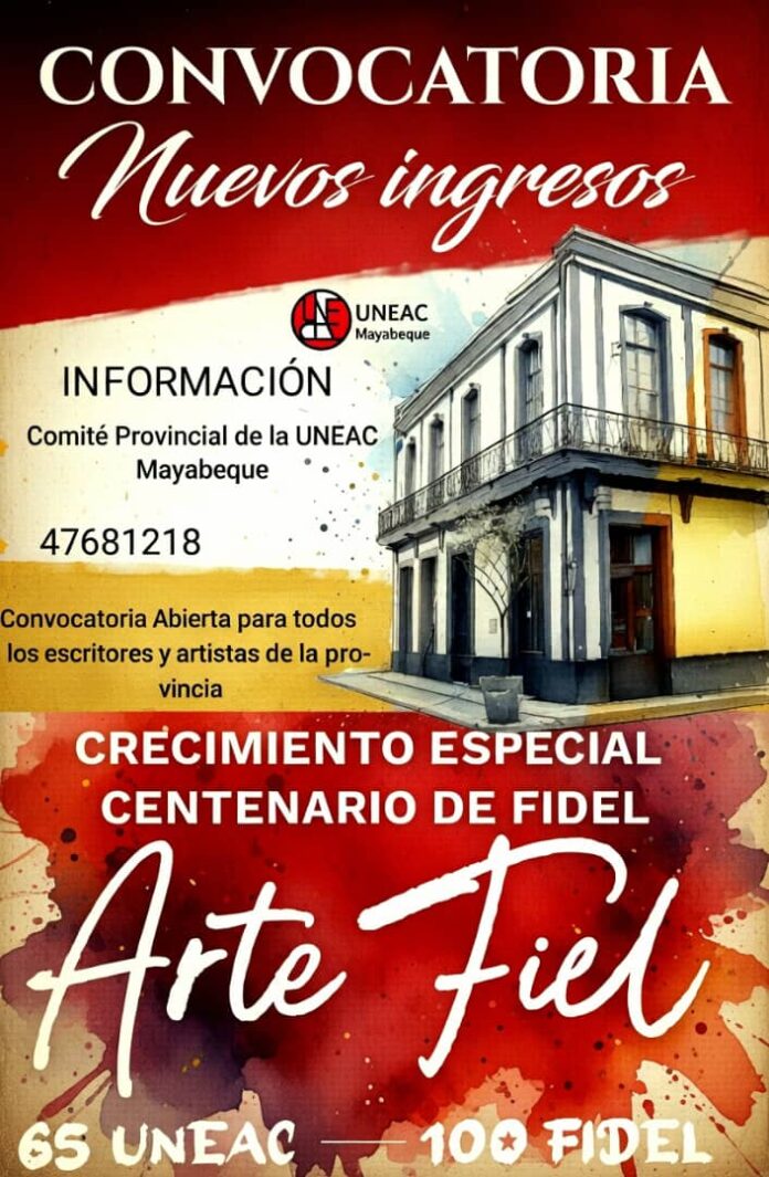 La Unión de Escritores y Artistas de Cuba (UNEAC) convocó a un nuevo proceso de crecimiento institucional en saludo al Centenario del natalicio del Comandante en Jefe Fidel Castro Ruz y al aniversario 65 de la organización, oportunidad que también se abre para creadores y artistas de la provincia de Mayabeque interesados en integrar la vanguardia artística y literaria del país.
