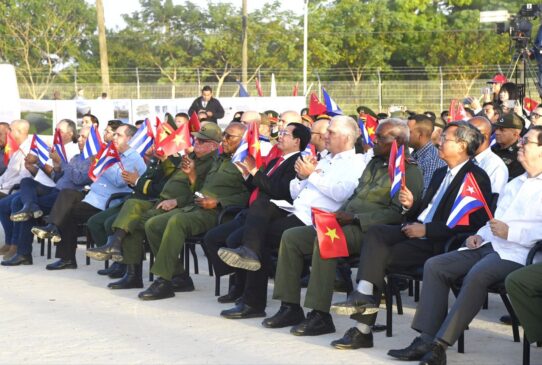 Al finalizar la ceremonia, el presidente Díaz-Canel junto al vice primer ministro vietnamita, Ho Quoc Dung, y varios miembros de la delegación de ambos países, colocaron la primera piedra del parque solar fotovoltaico “Vista Alegre”.