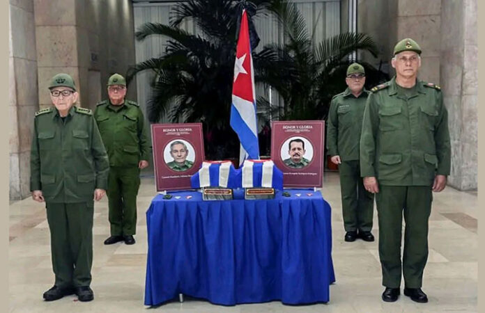 La Habana, 16 ene (ACN) Como parte del sentido homenaje del pueblo a los héroes caídos en feroz combate en Venezuela, el General de Ejército Raúl Castro Ruz, líder al frente de la Revolución cubana, acompañado por el Presidente Miguel Díaz-Canel, encabezó este jueves la última guardia de honor a los combatientes caídos en Venezuela, en la sede del Ministerio de las Fuerzas Armadas Revolucionarias.