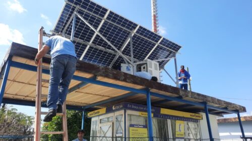 Trabajadores de ETECSA en Mayabeque laboran en el montaje de sistemas fotovoltaicos en el municipio de Güines con el fin de garantizar los servicios...